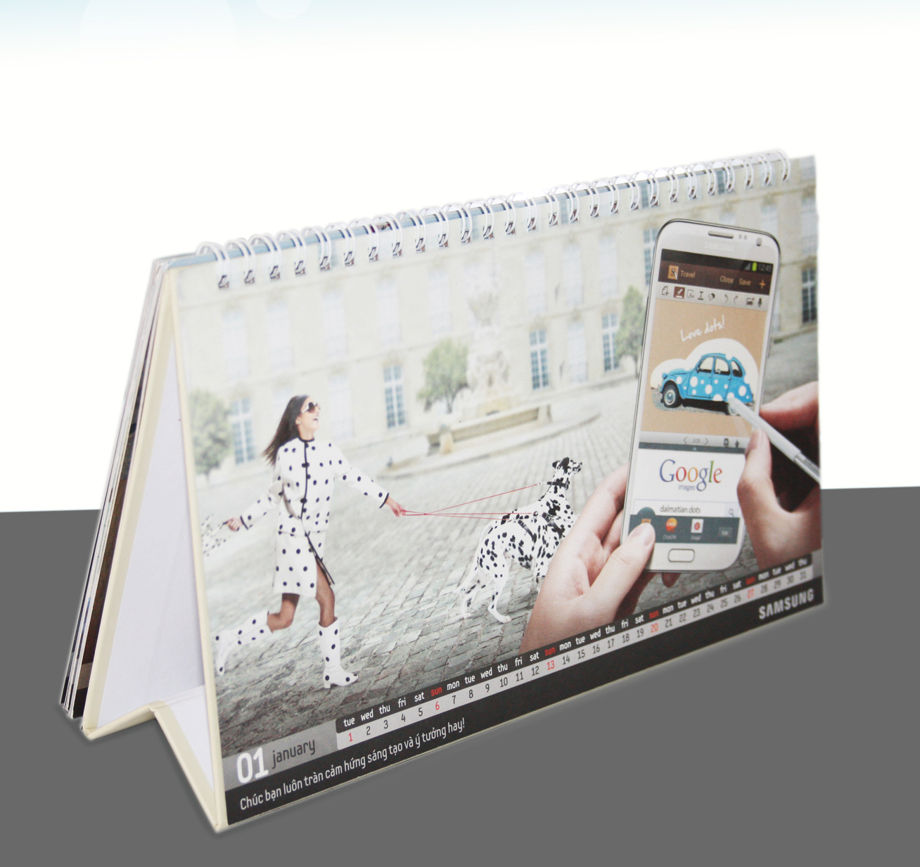 Đơn vị chúng tôi vừa thết kế mẫu lịch tết và gia công thành phẩm lịch tết các loại như lịch để bàn đế gỗ, lịch để bàn đế mica, lịch để bàn đế giấy carton bồi giấy mỹ thuật hoặc simily, với đủ kiểu dáng mới lạ, Ngoài ra còn có lịch treo tường đóng lò xo 5 -13 tờ, tương tự như lịchtreo tường lò xo lịch nẹp thiết cũng có số lượng tờ tương tự nhưng giấy mỏng hơn. Đem lại sự lựa chọn phong phú cho khách hàng trong dịp Tết Giáp Ngọ 2014 này.